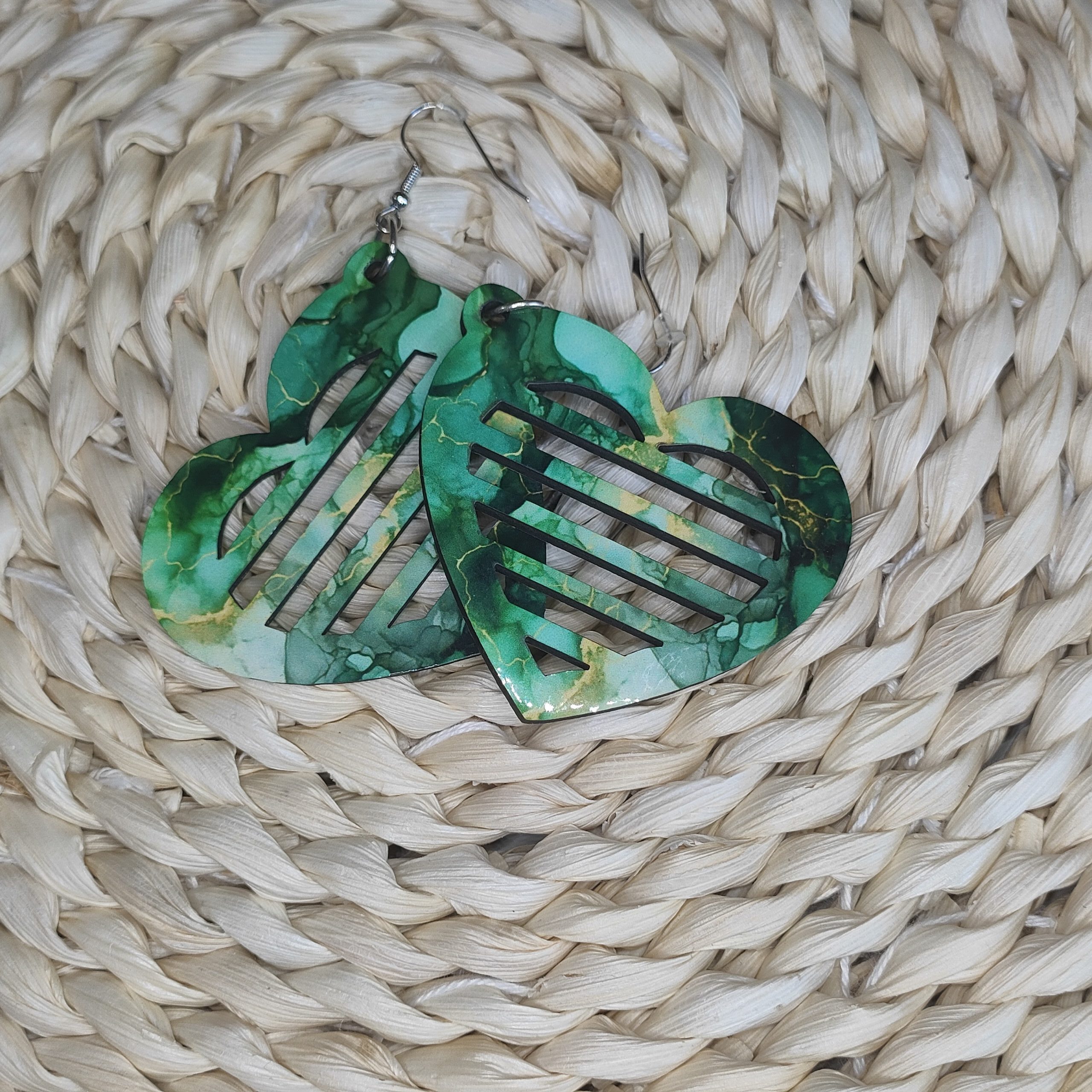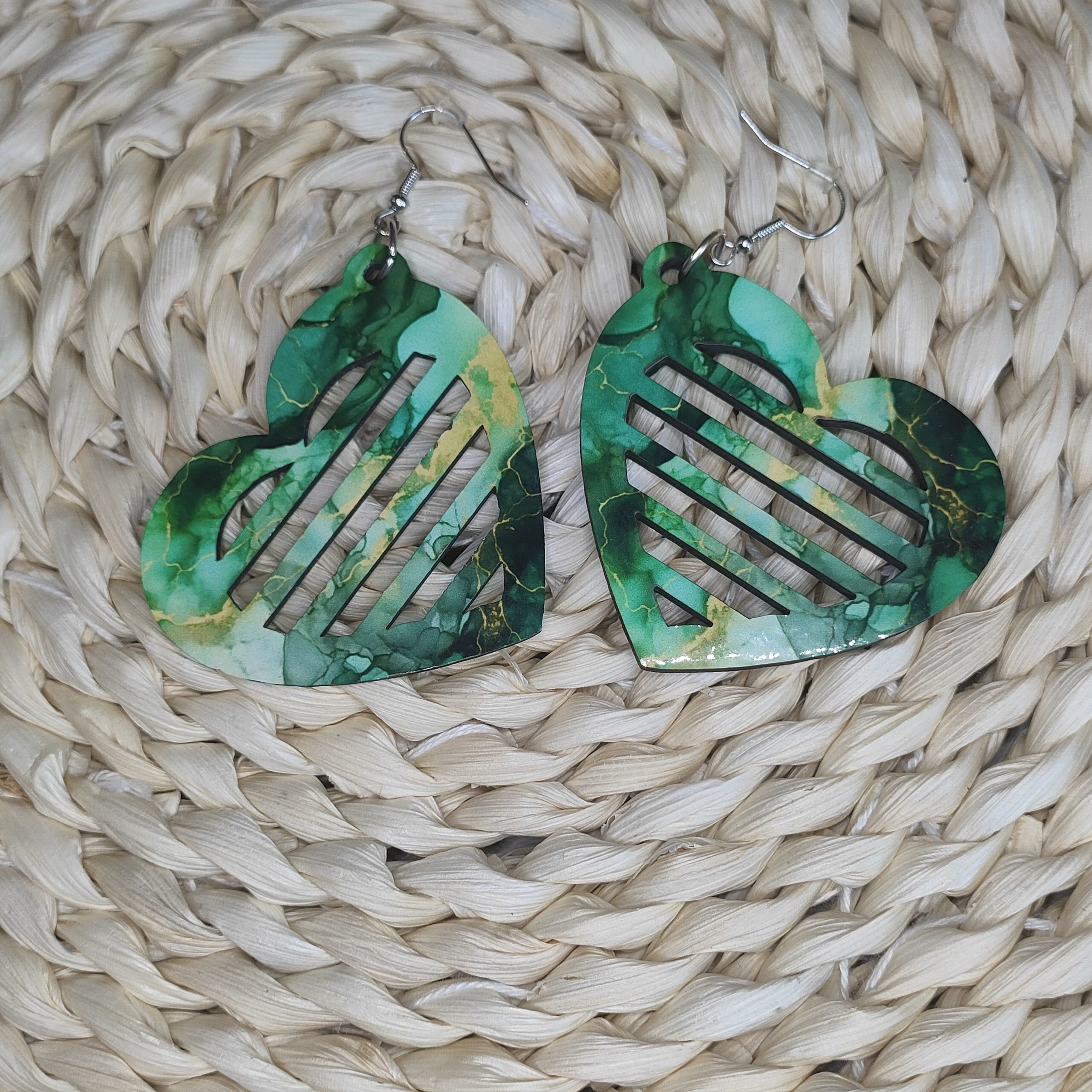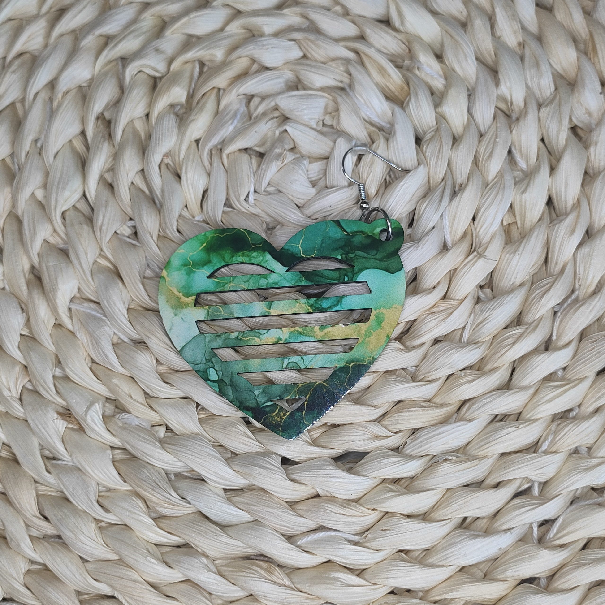 Boucles d'oreilles en bois, en forme de cœur, avec découpe intérieure formant un cœur ouvert.