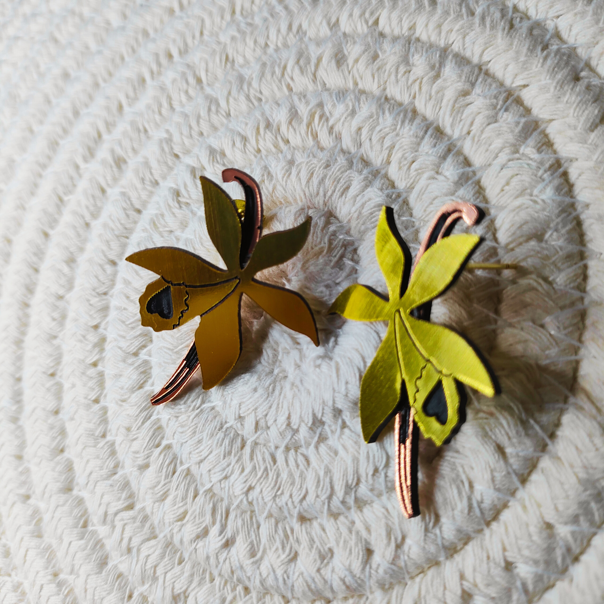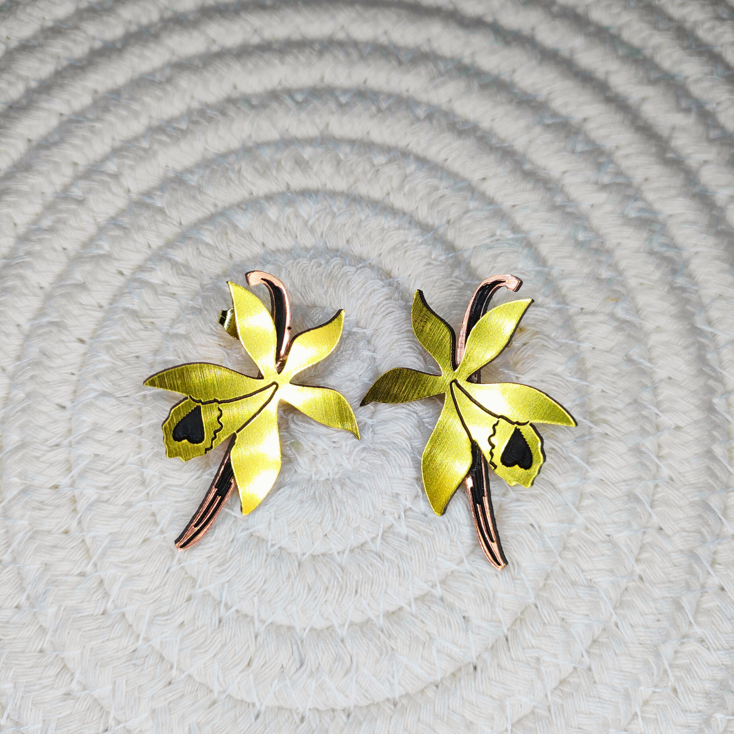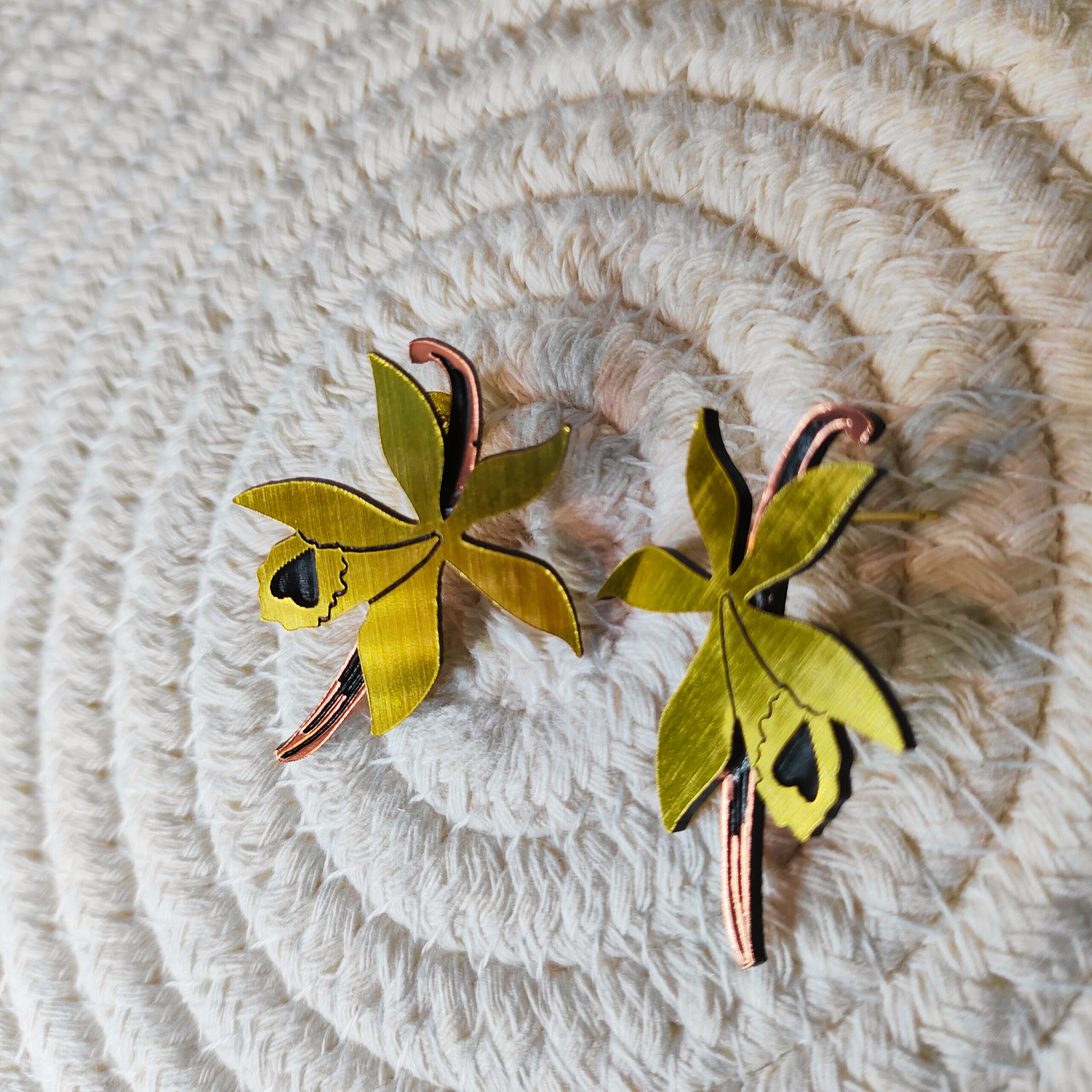 Boucles d’oreilles bicolores, inspirées du design délicat et raffiné de la fleur de vanille.
